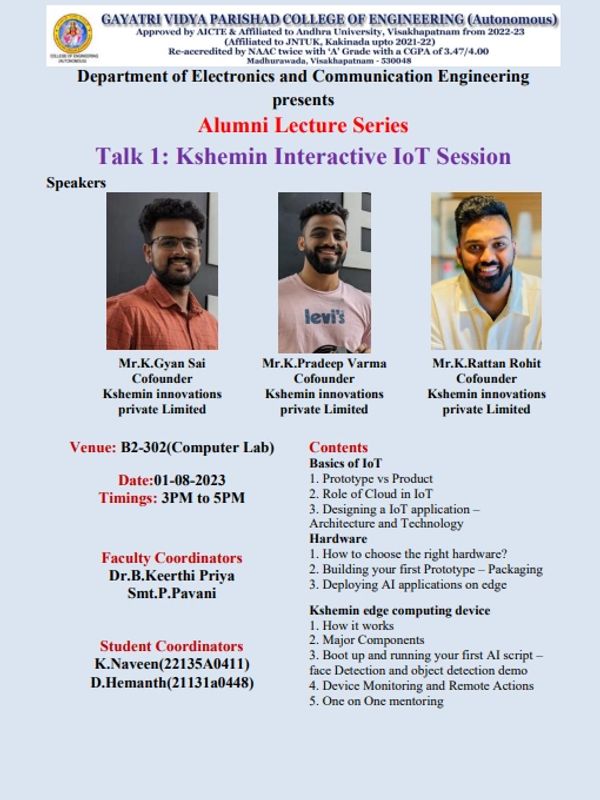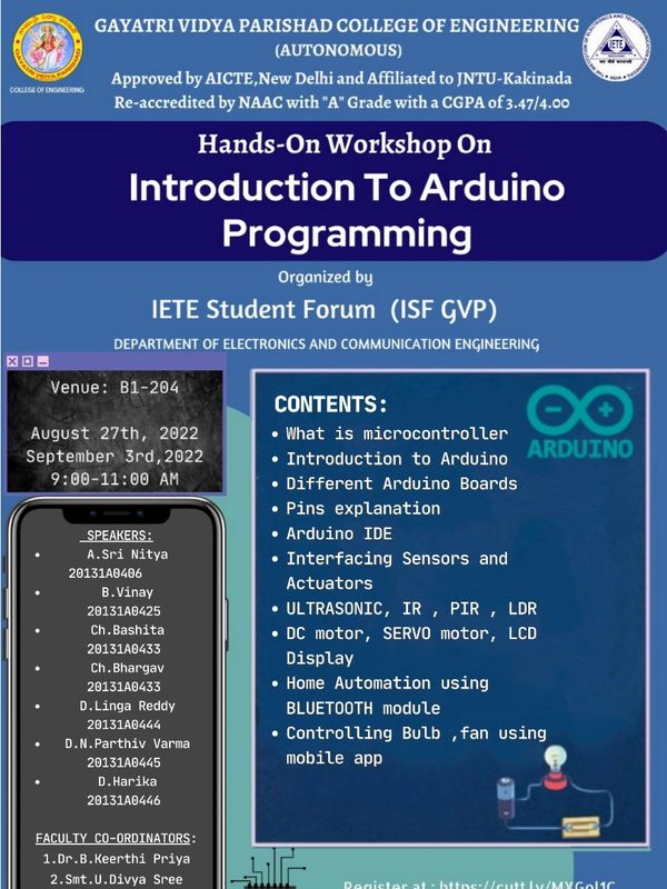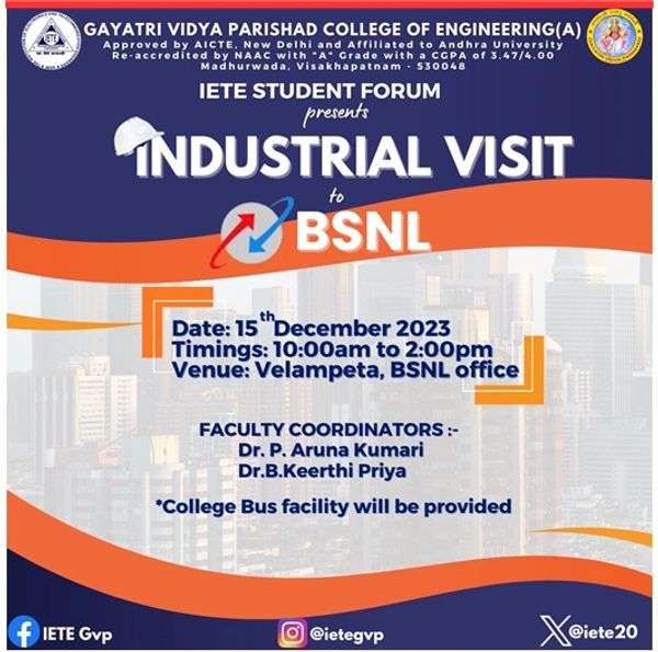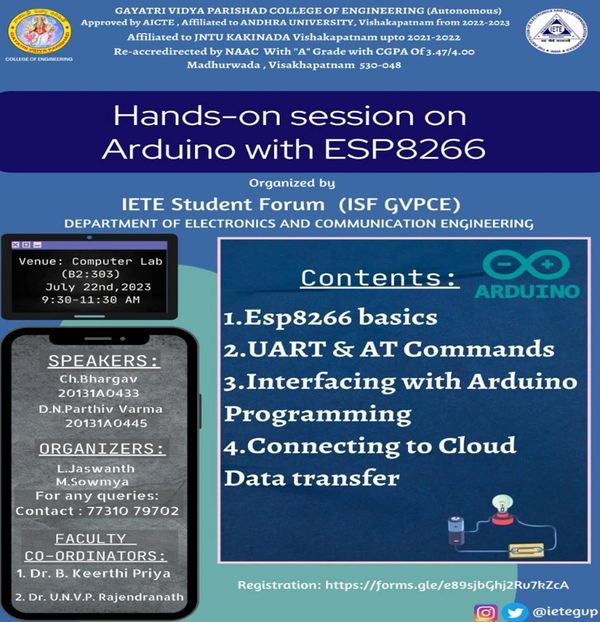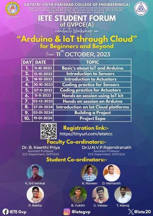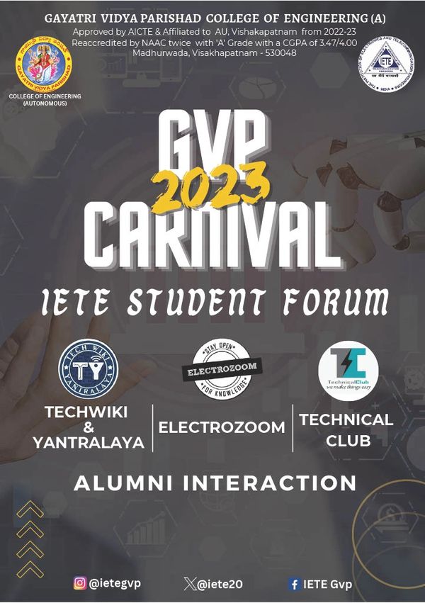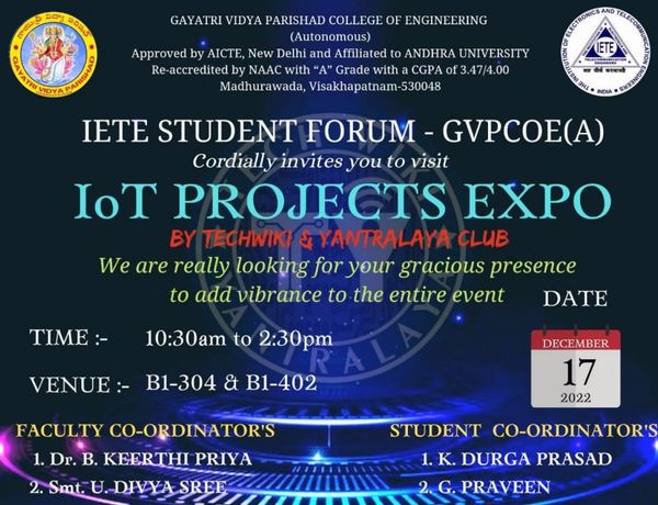 A one day "IoT Projects Expo" is organized by IETE Student Forum GVPCE(A) encouraging students to exhibit their innovative and application oriented models based on IoT Technologies