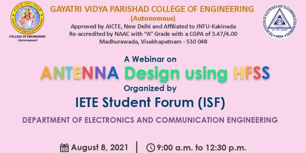 A Webinar on ANTENNA Design using HFSS Organized by IETE Student Forum(ISF) Department of Electronics and Communication Engineering, Gayatri Vidya Parishad College Of Engineering (Autonomous) on 8th August 2021.