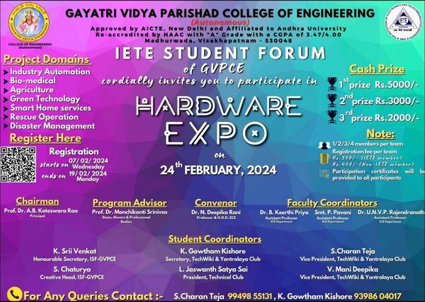 IETE Student Forum GVPCE(A) has conducted a Inter-college “Hardware Expo” .A total of 219 students from various colleges have participated in the “Hardware Expo” and have showcased their projects.