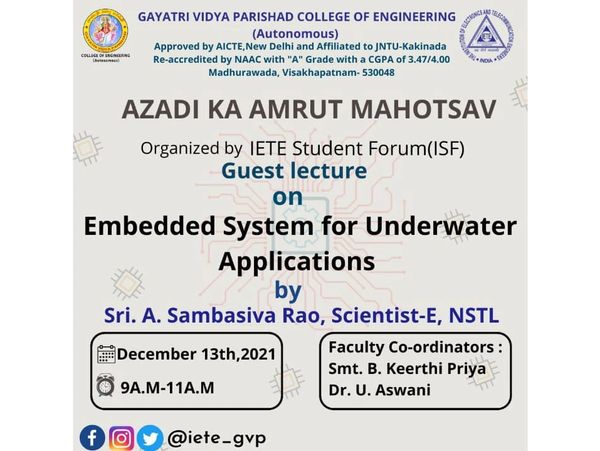 A Webinar on Embedded System for Underwater Applications Organized by IETE Student Forum(ISF) Department of Electronics and Communication Engineering, Gayatri Vidya Parishad College Of Engineering (Autonomous) on 13th December 2021.