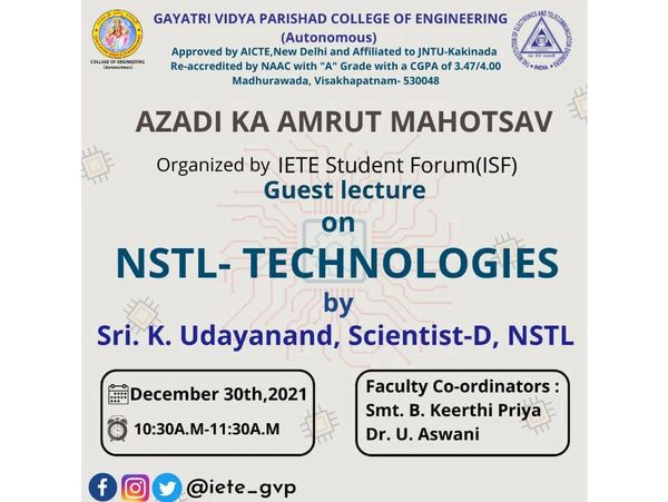 A Webinar on NSTL-TECHNOLOGIES Organized by IETE Student Forum(ISF) Department of Electronics and Communication Engineering, Gayatri Vidya Parishad College Of Engineering (Autonomous) on 30th December 2021.