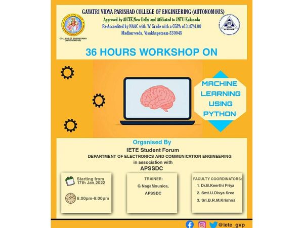 A 36 hours hands-on workshop organized from 17th January 2022 to 3rd February 2022 on Machine Learning Using Python.